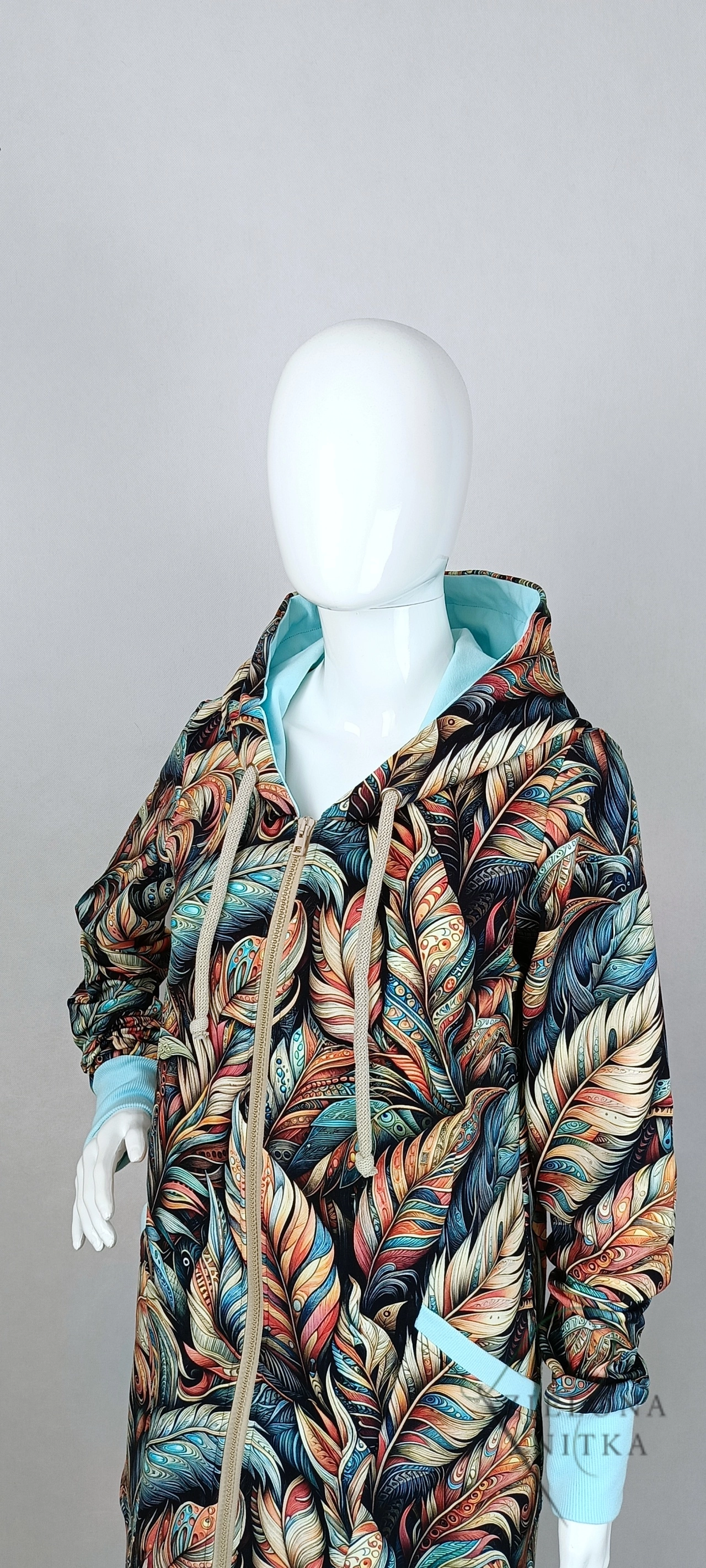 Długa bluza damska na zamek z kapturem i ozdobnym zamkiem