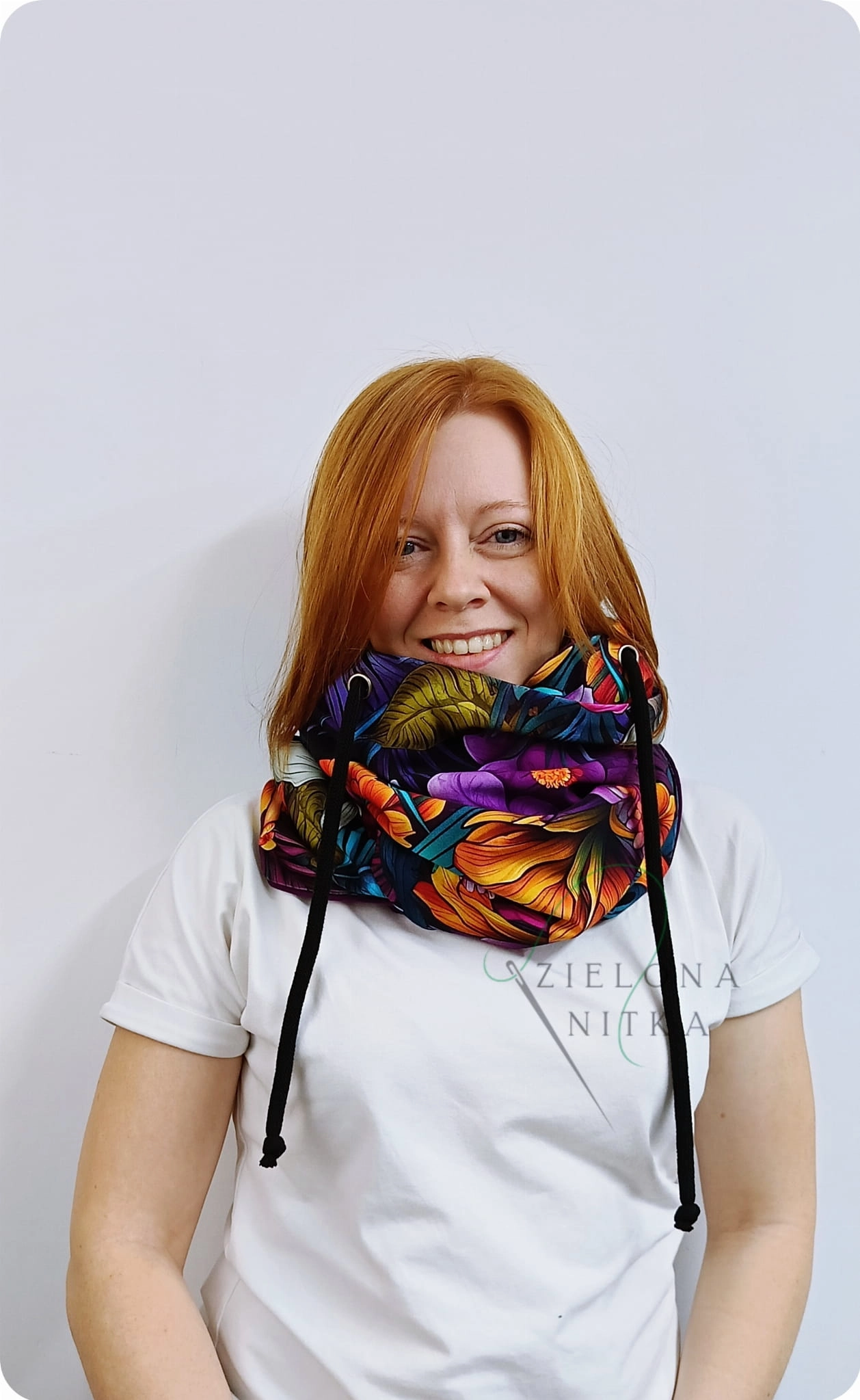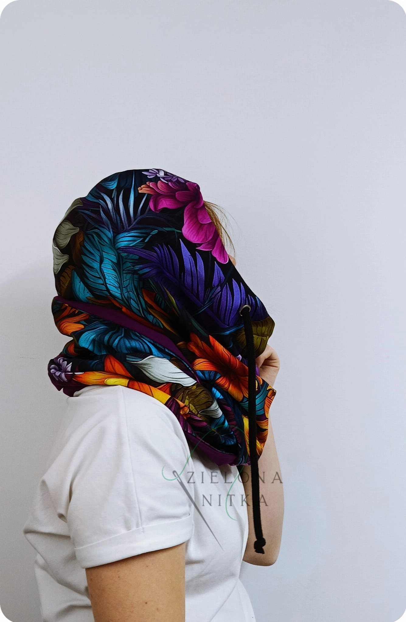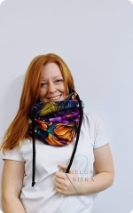 Ciepły i miękki komino-kaptur, idealny na chłodne dni. Wykonany z podwójnej warstwy dzianiny – zewnętrzna warstwa z wzorem, wnętrze w kolorze fioletowym. Chroni przed mrozem i wiatrem, a elastyczny materiał doskonale układa się na głowie, zapewniając komfort noszenia.
