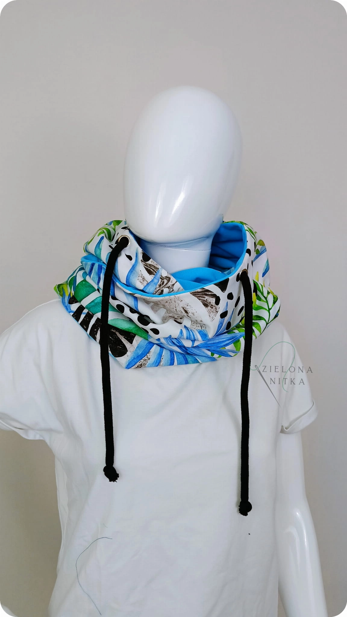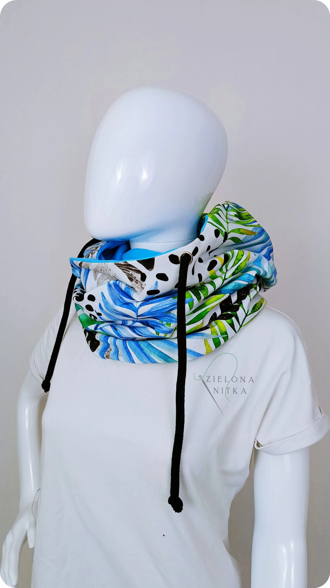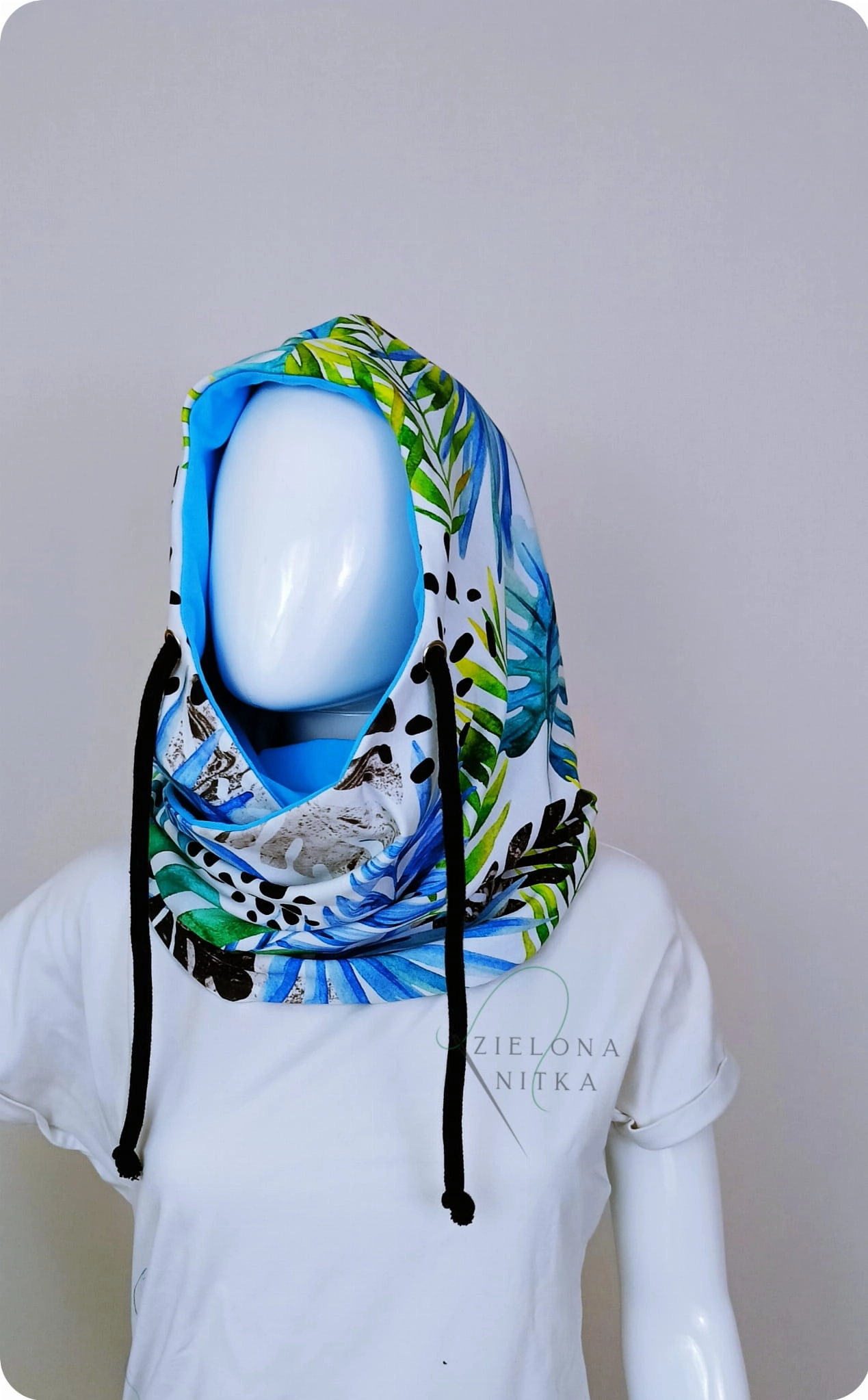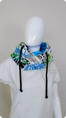 Ciepły i miękki komino-kaptur, idealny na chłodne dni. Wykonany z podwójnej warstwy dzianiny – zewnętrzna warstwa we wzór palm, wnętrze w kolorze niebieskim. Chroni przed mrozem i wiatrem, a elastyczny materiał doskonale układa się na głowie, zapewniając komfort noszenia.