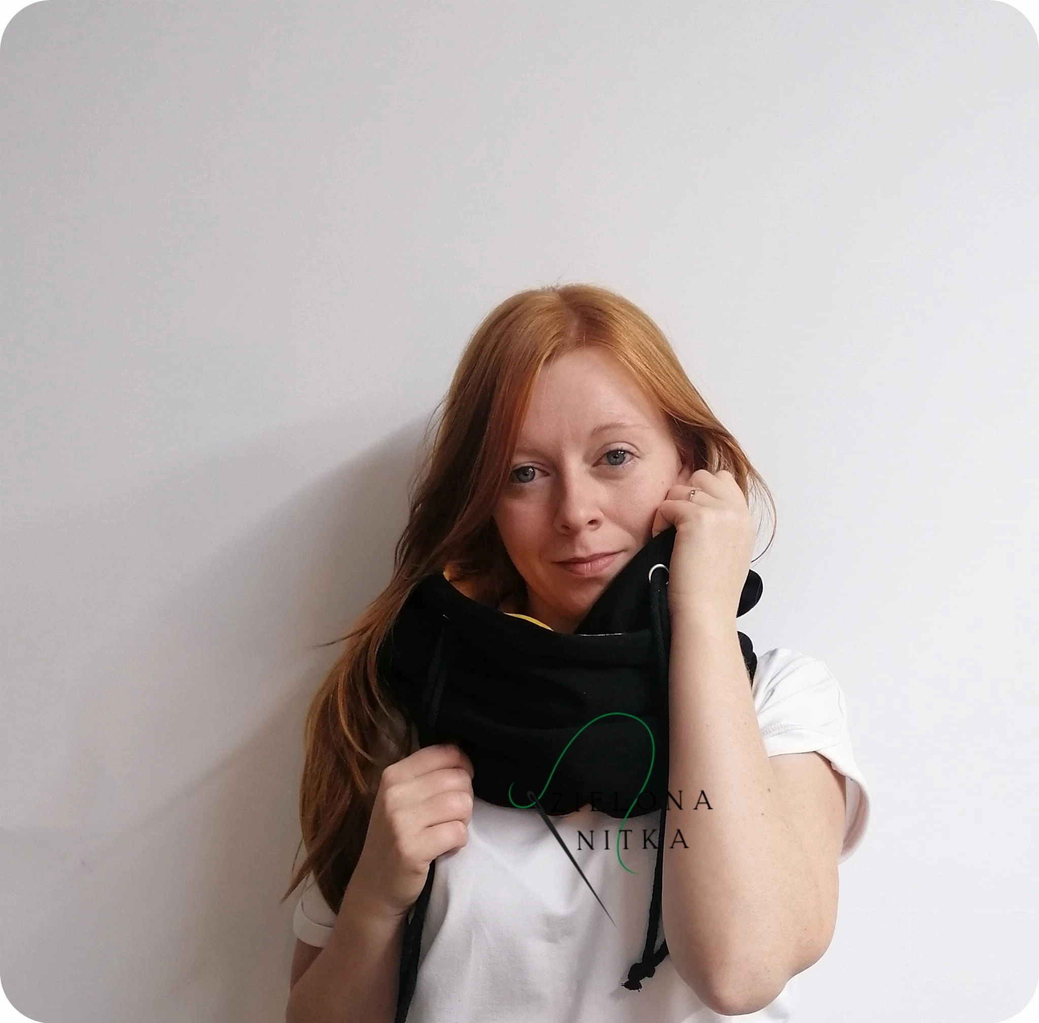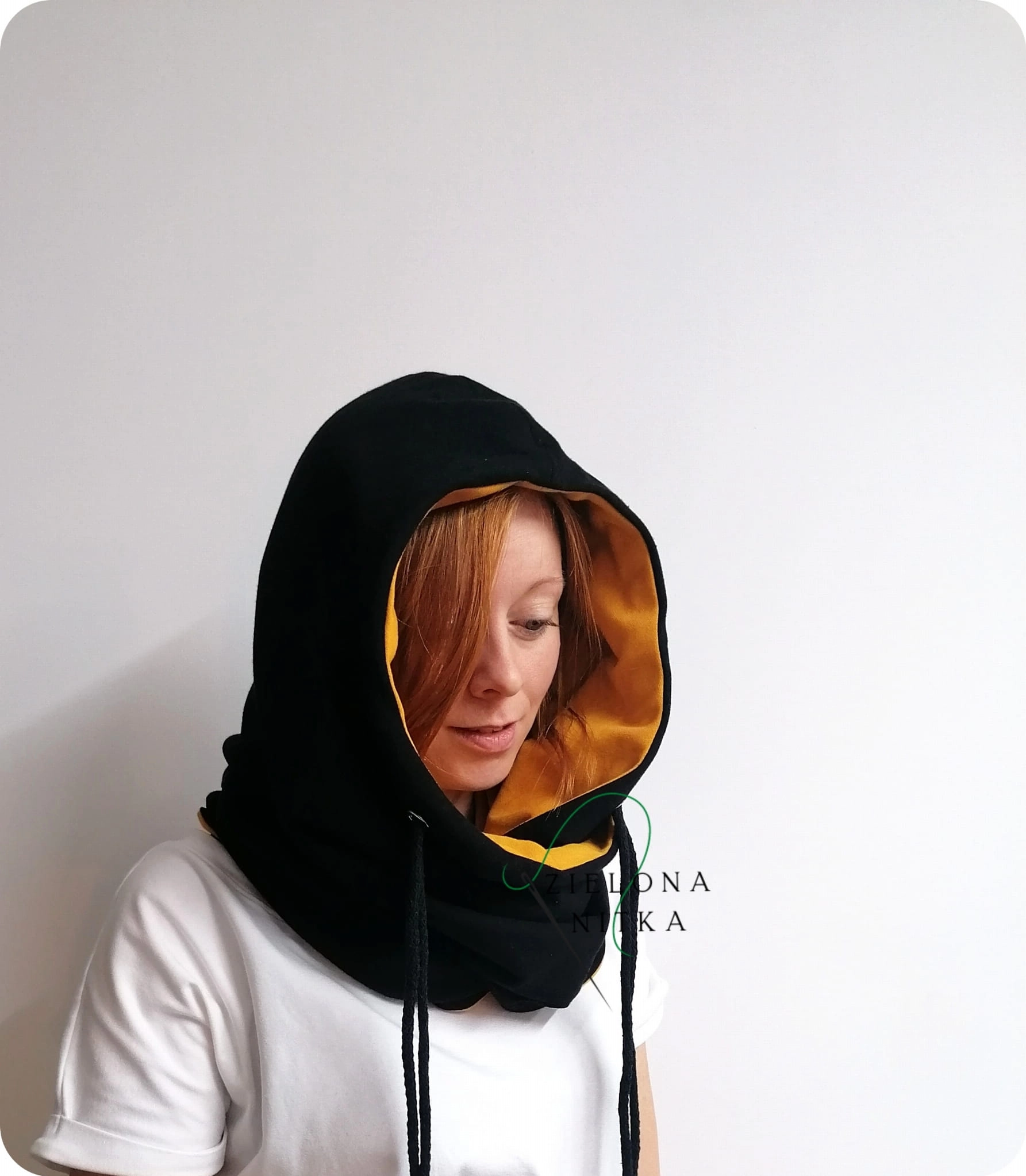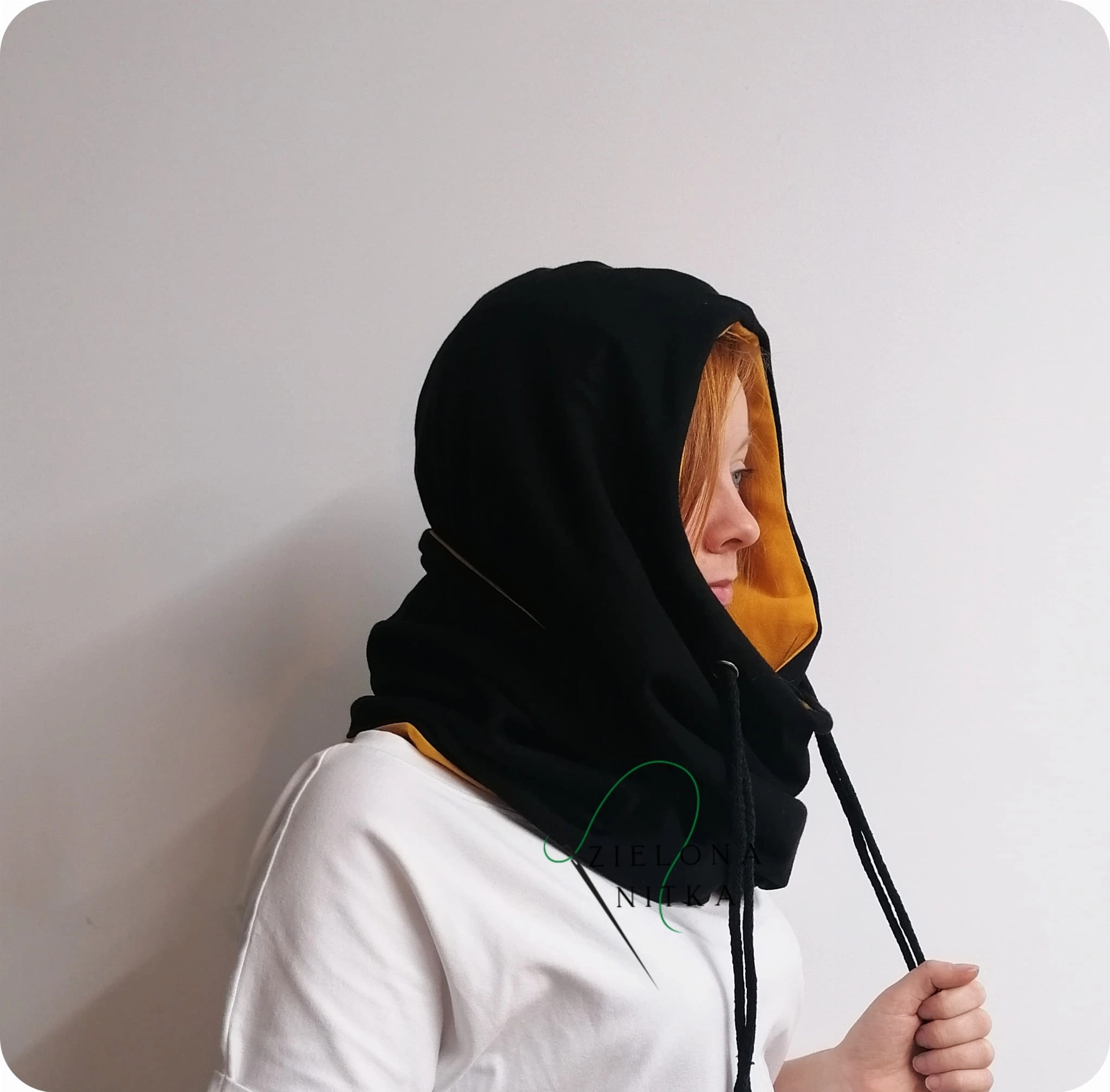 Ciepły i miękki komino-kaptur, który doskonale chroni przed mrozem i wiatrem. Wykonany z podwójnej warstwy dzianiny – zewnętrzna warstwa w kolorze czarnym, wnętrze w kolorze miodowym. Doskonale układa się na głowie, zapewniając komfort i wygodę noszenia.