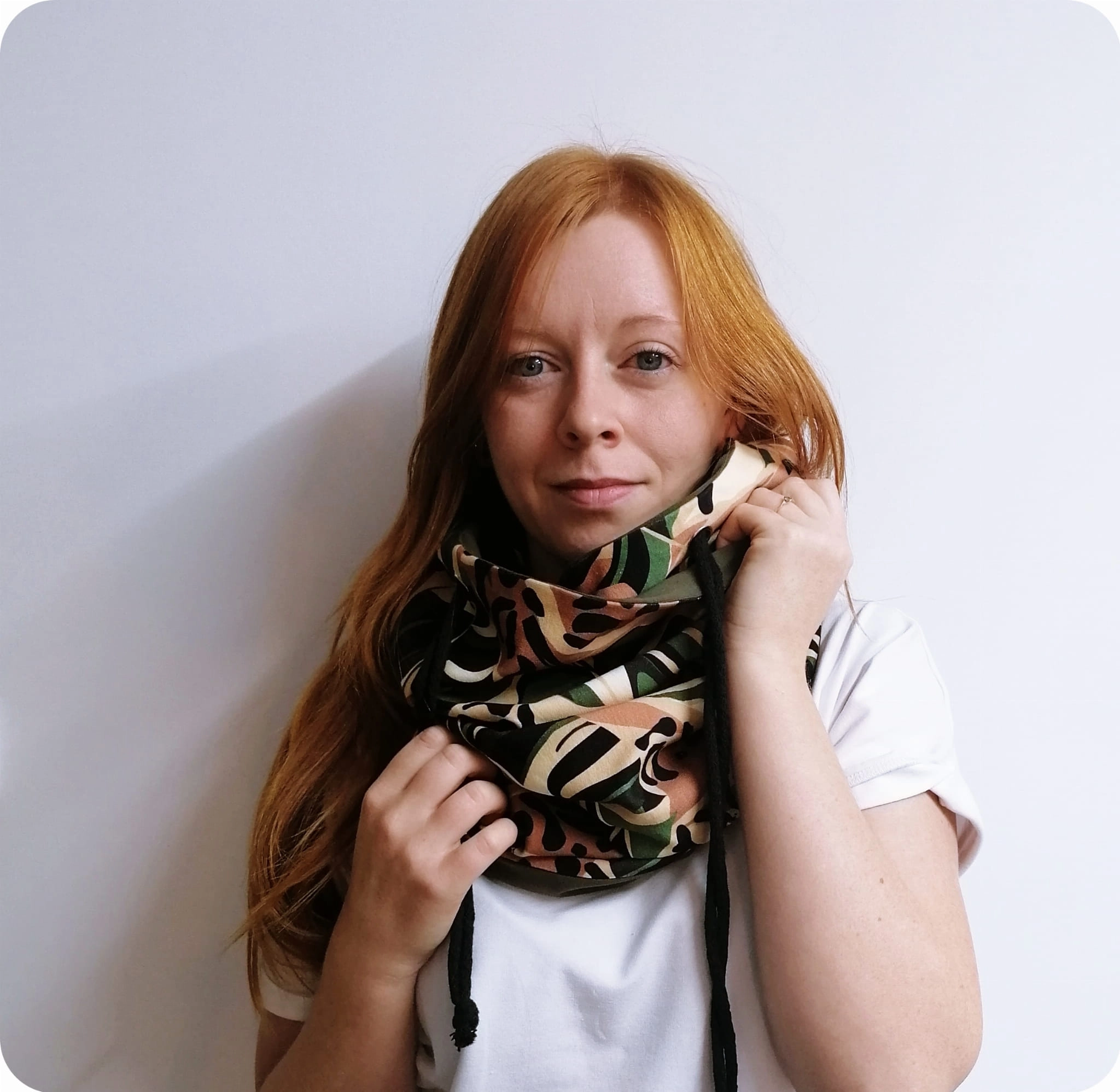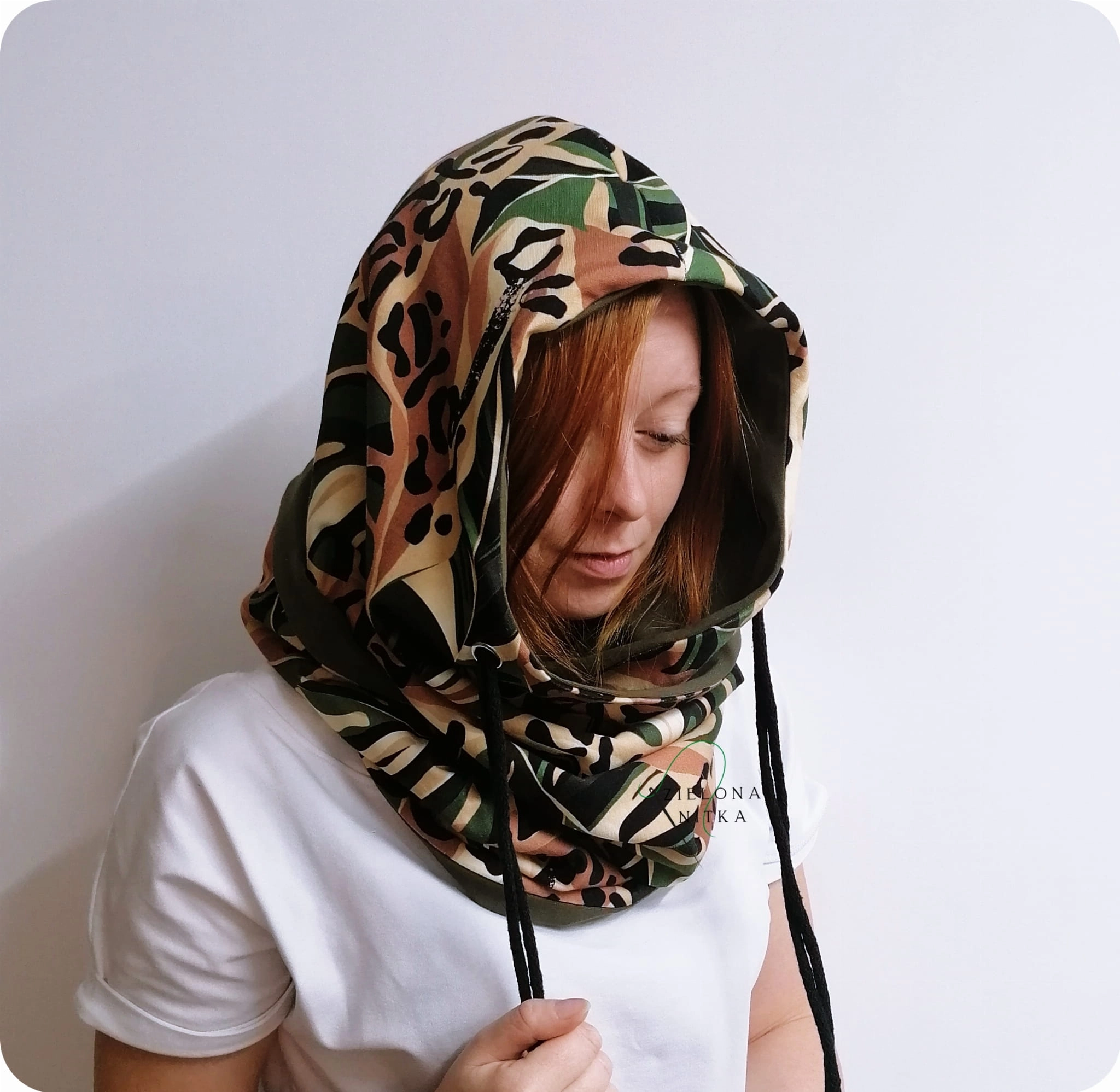 Ciepły i miękki komino-kaptur, który skutecznie chroni przed mrozem i wiatrem. Wykonany z podwójnej warstwy dzianiny – zewnętrzna warstwa we wzór liści panterki, wnętrze w kolorze zielonym. Doskonale układa się na głowie, zapewniając komfort i wygodę noszenia.
