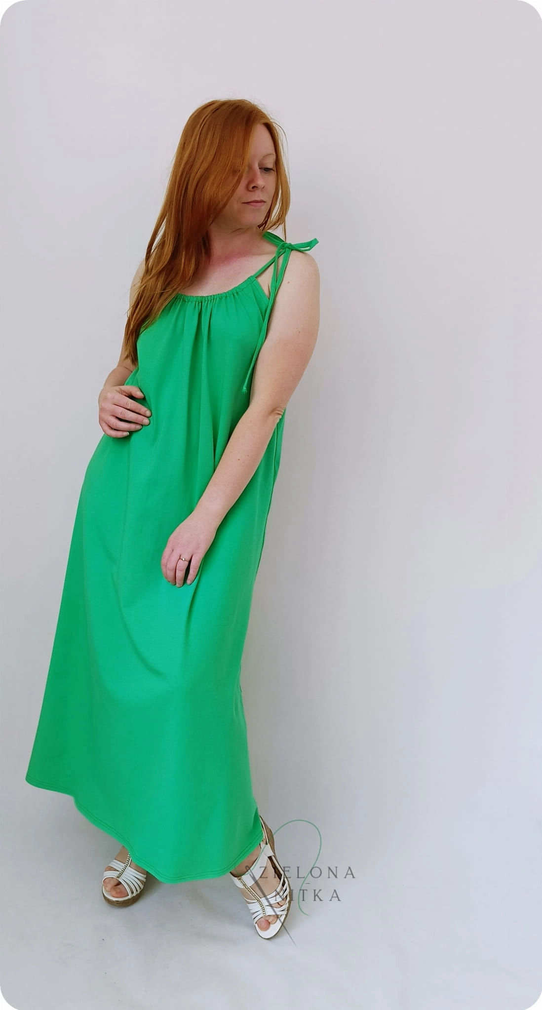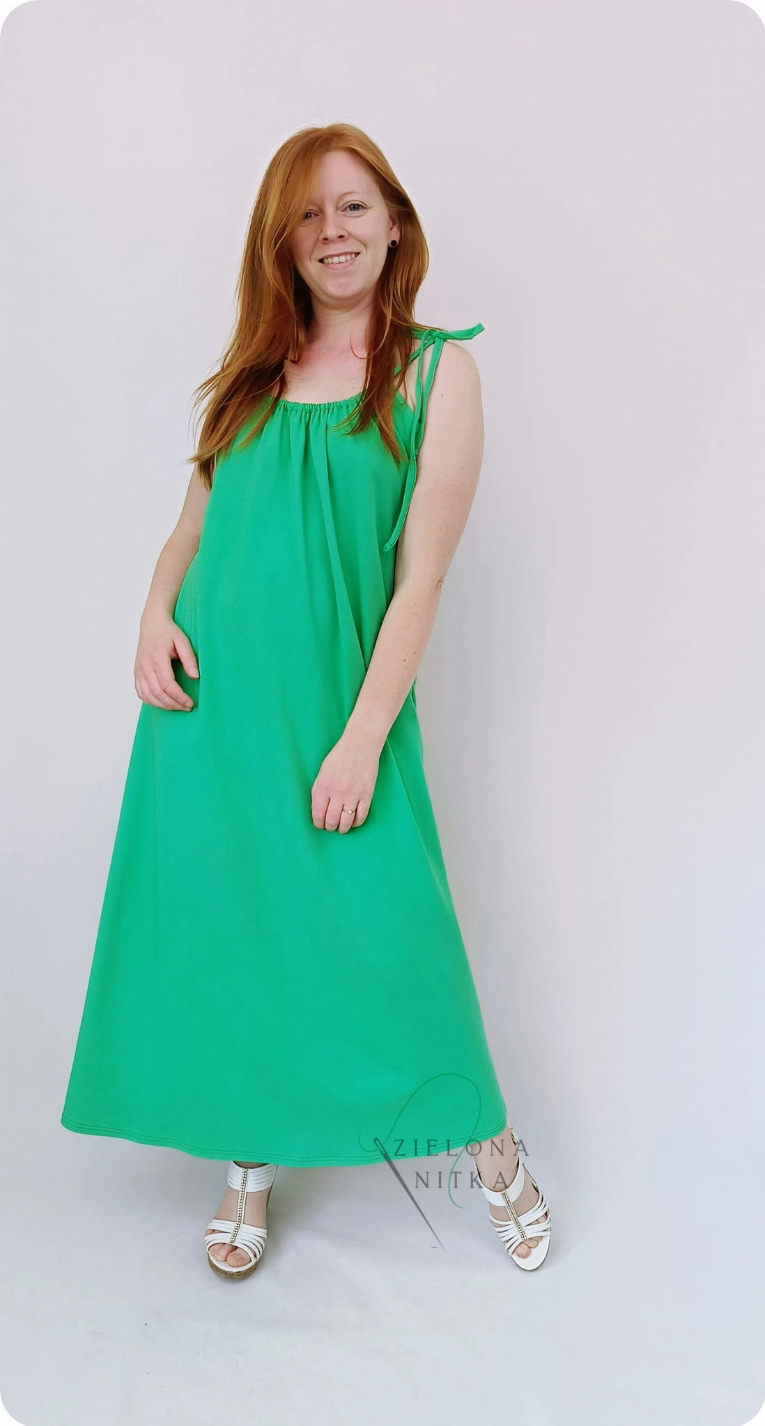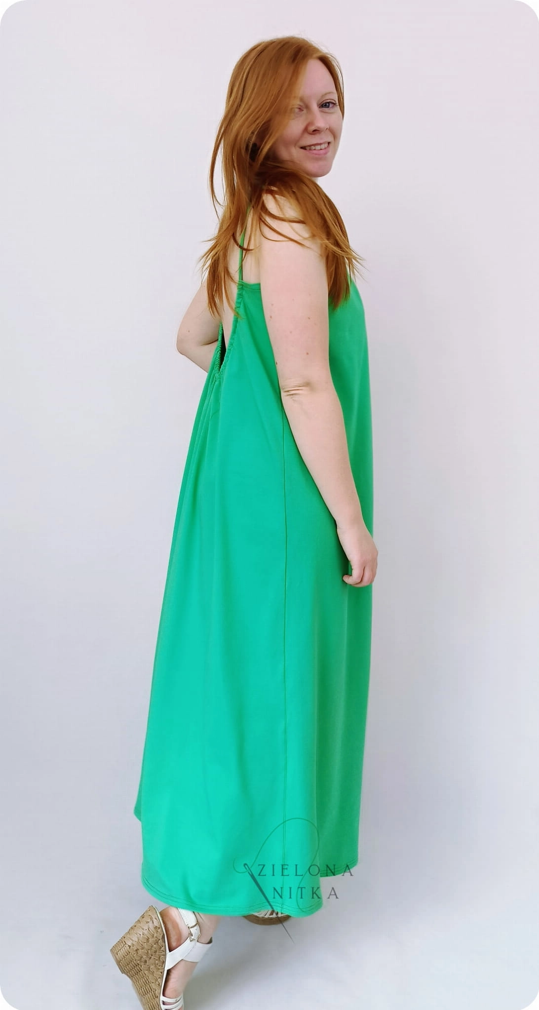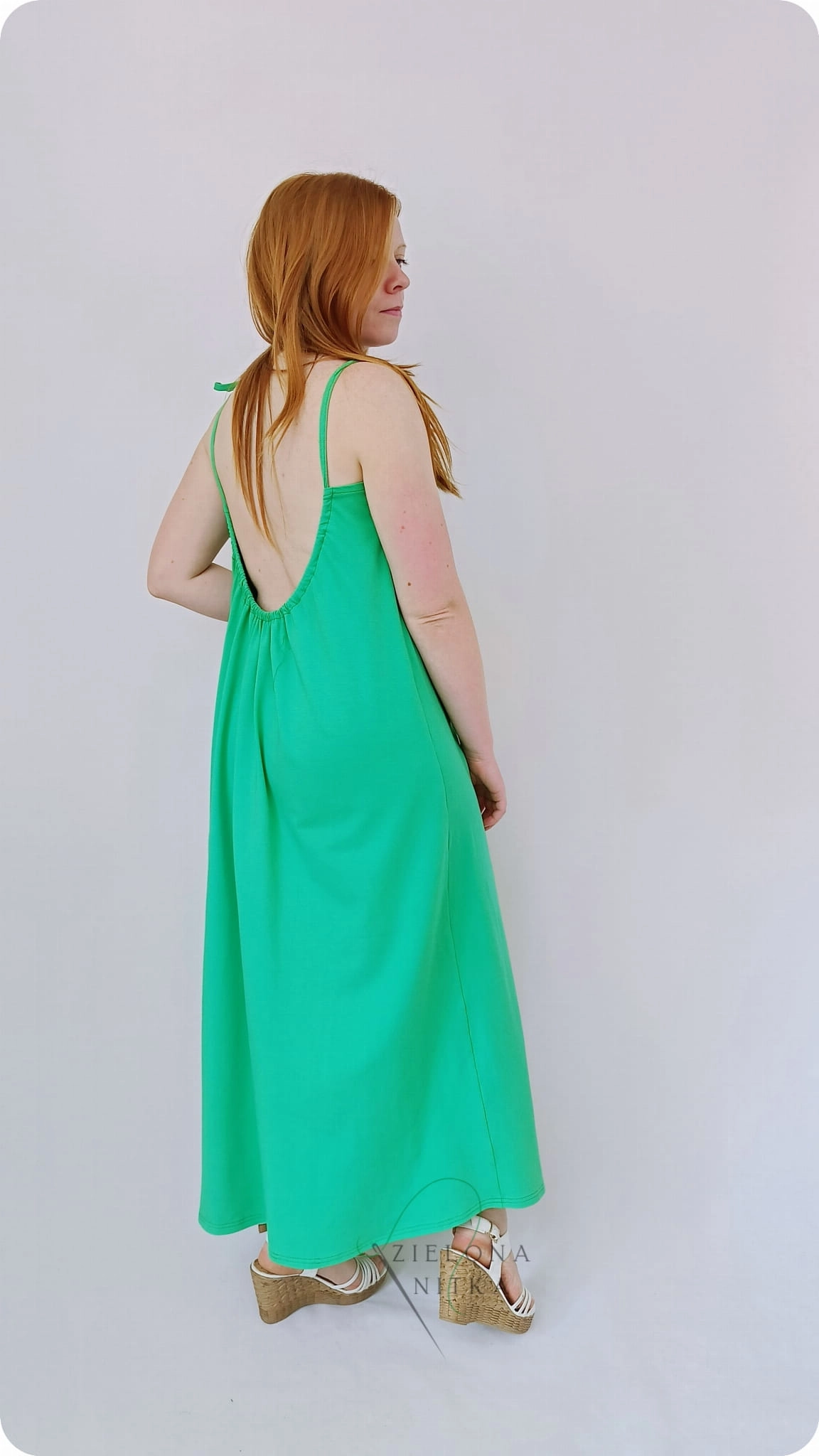 Letnia sukienka damska BALI o kroju litery A to lekka i wygodna propozycja na ciepłe dni. Model posiada wąskie ramiączka, okrągły dekolt z marszczeniem z przodu oraz głęboki dekolt z tyłu, co nadaje sukience lekkości i kobiecego charakteru.